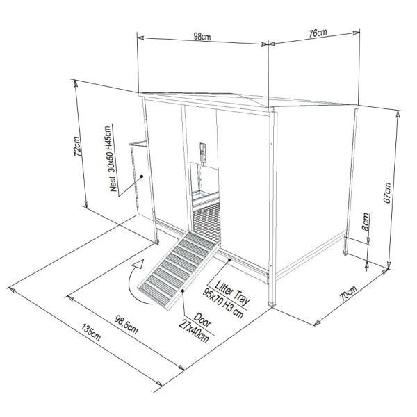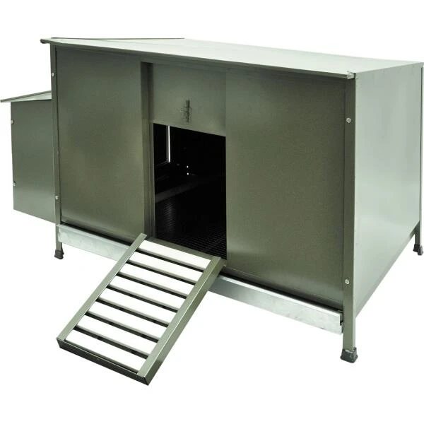 Het kippenhok Fontana is gegalvaniseerd en bestand tegen roest. In tegenstelling tot een kippenhok in hout is dit metalen hok onderhoudsvrij. Bovendien biedt het een uitstekende bescherming tegen vossen. De anti-slip loopbrug kan opgeklapt worden tot deur om het hok ’s nachts te kunnen sluiten. Het is verder uitgerust met 2 zitstokken, een schuifdak, een nest en een mestlade om het makkelijk te kunnen reinigen.